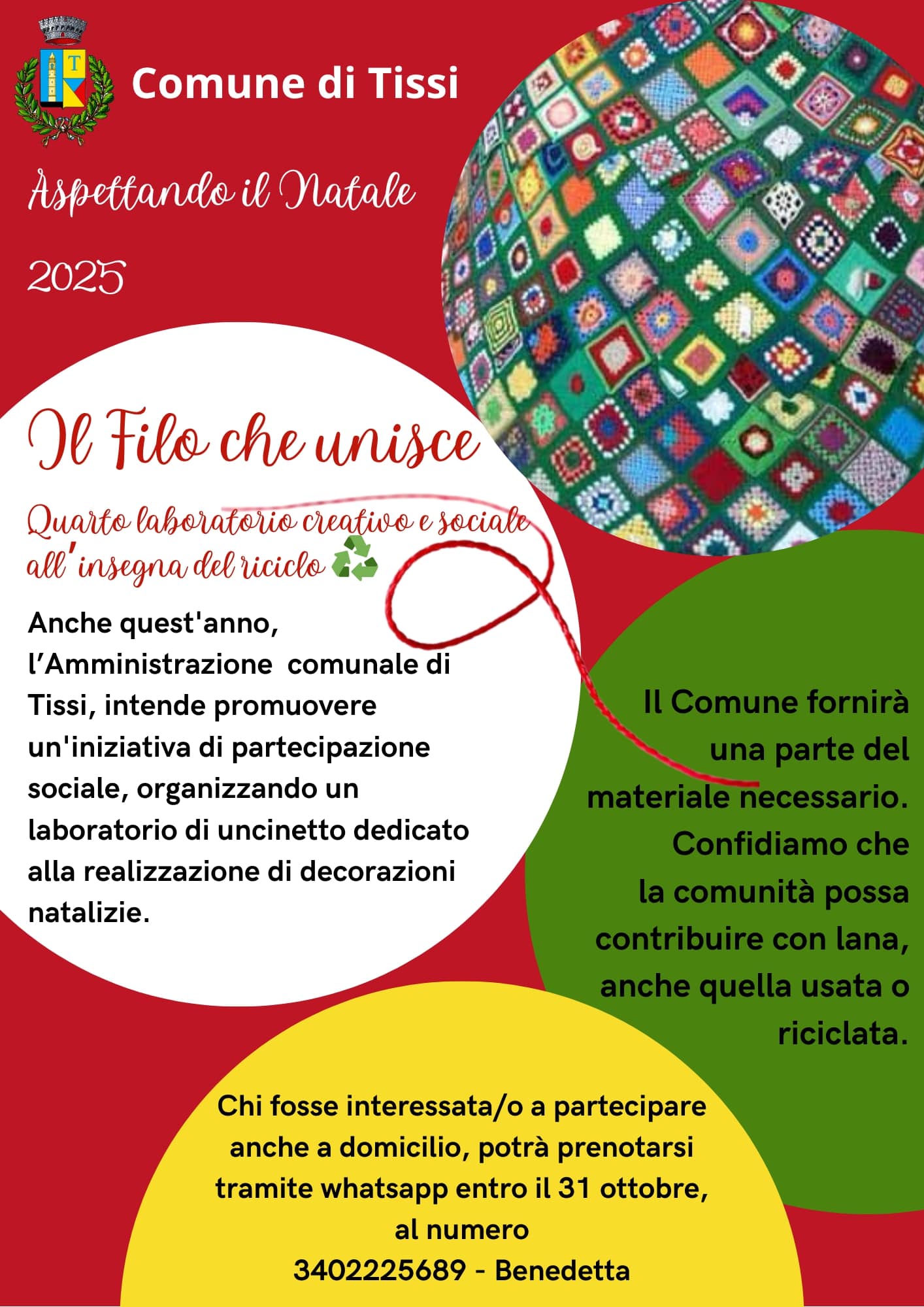Anche quest'anno l'Amministrazione comunale di Tissi intende promuovere un'iniziativa di partecipazione sociale, organizzando un laboratorio di uncinetto dedicato alla realizzazione di decorazioni natalizie.